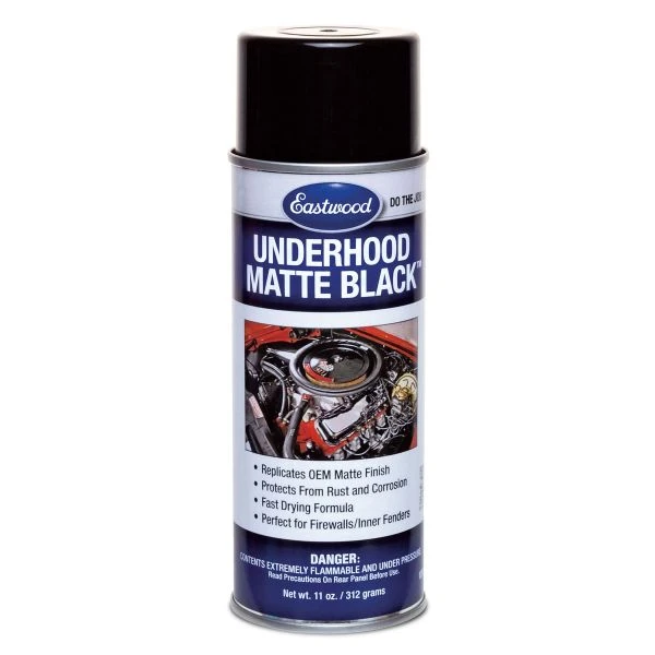 UNDERHOOD BLACK® Matte is the correct shade of black, having just the right matte finish many older car manufacturers used on radiator supports, inner fenders, firewalls, underhood brackets, and other parts. Hardware store black paints are either too thick, too glossy, or the wrong color. Just clean, degrease, and prepare the parts well, then spray on for a “factory-like” finish. This acrylic lacquer withstands up to 250° F and goes on thin for a smooth finish that will not hide surface details. Made in the USA. Coverage approx 6 sq ft. 5%-9% Gloss Level.